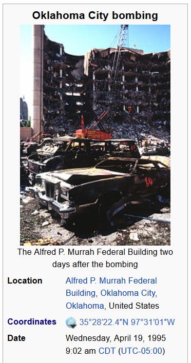 The Oklahoma City bombing was a domestic terrorist bomb attack on the Alfred P. Murrah Federal Building in downtown Oklahoma City on April 19, 1995.
